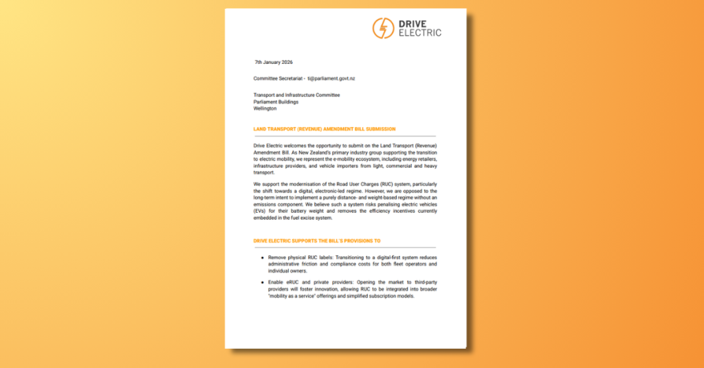 In November 2025, the Government called for public submissions on the Land Transport (Revenue) Amendment Bill. This bill seeks to ensure that key revenue tools effectively support a user-pays basis for funding land transport. It would do so by: Drive Electric supports the modernisation of the RUC system, particularly the shift towards a digital, electronic-led […]
