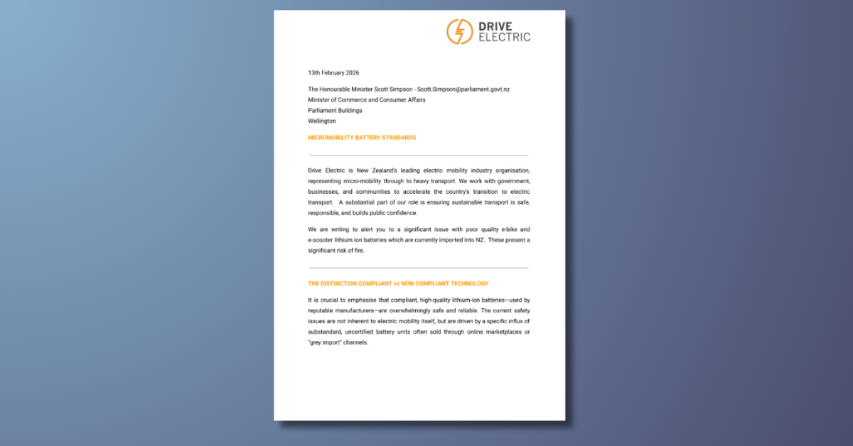Drive Electric has sent an urgent recommendation to the Honourable Minister Scott Simpson, Minister of Commerce and Consumer Affairs, about the safety of lithium-ion batteries currently entering the New Zealand market.